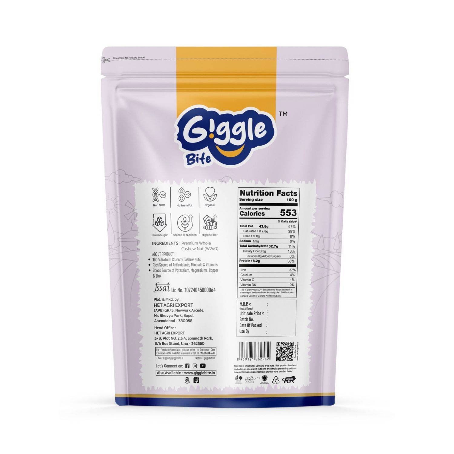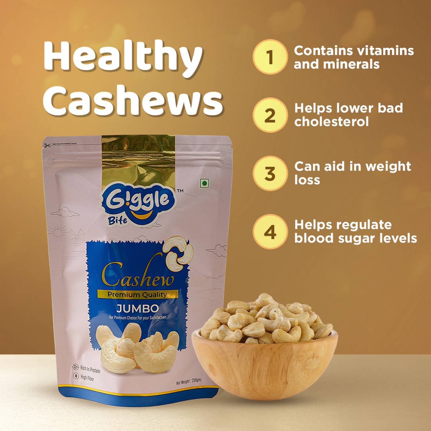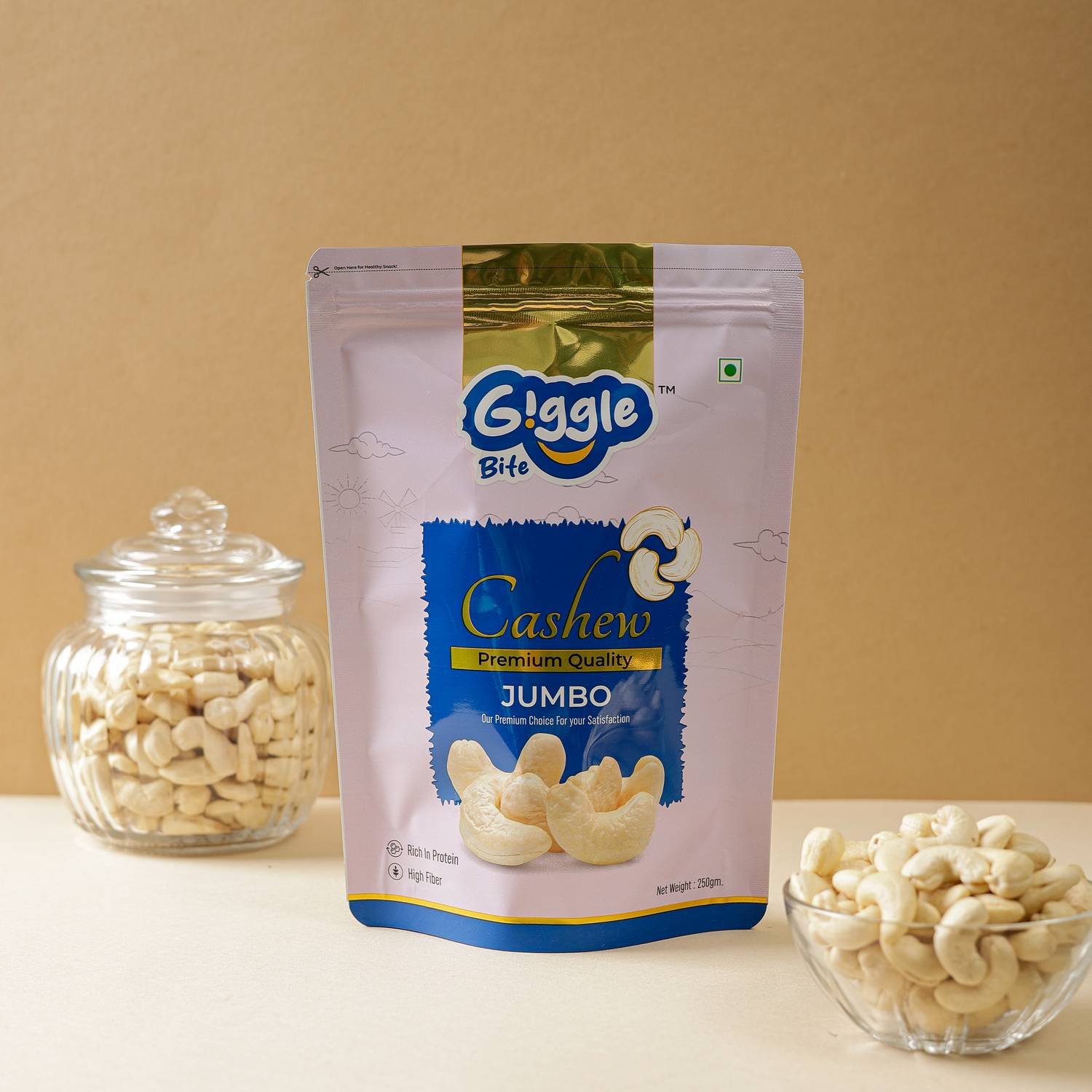 Discover the rich, creamy taste of Giggle Bite 100% Pure Whole Jumbo Cashews W240 Grade. Known for their larger size and premium quality, these cashews are perfect for snacking or elevating your culinary creations. Each cashew offers a delightful crunch and buttery flavor that’s simply irresistible.